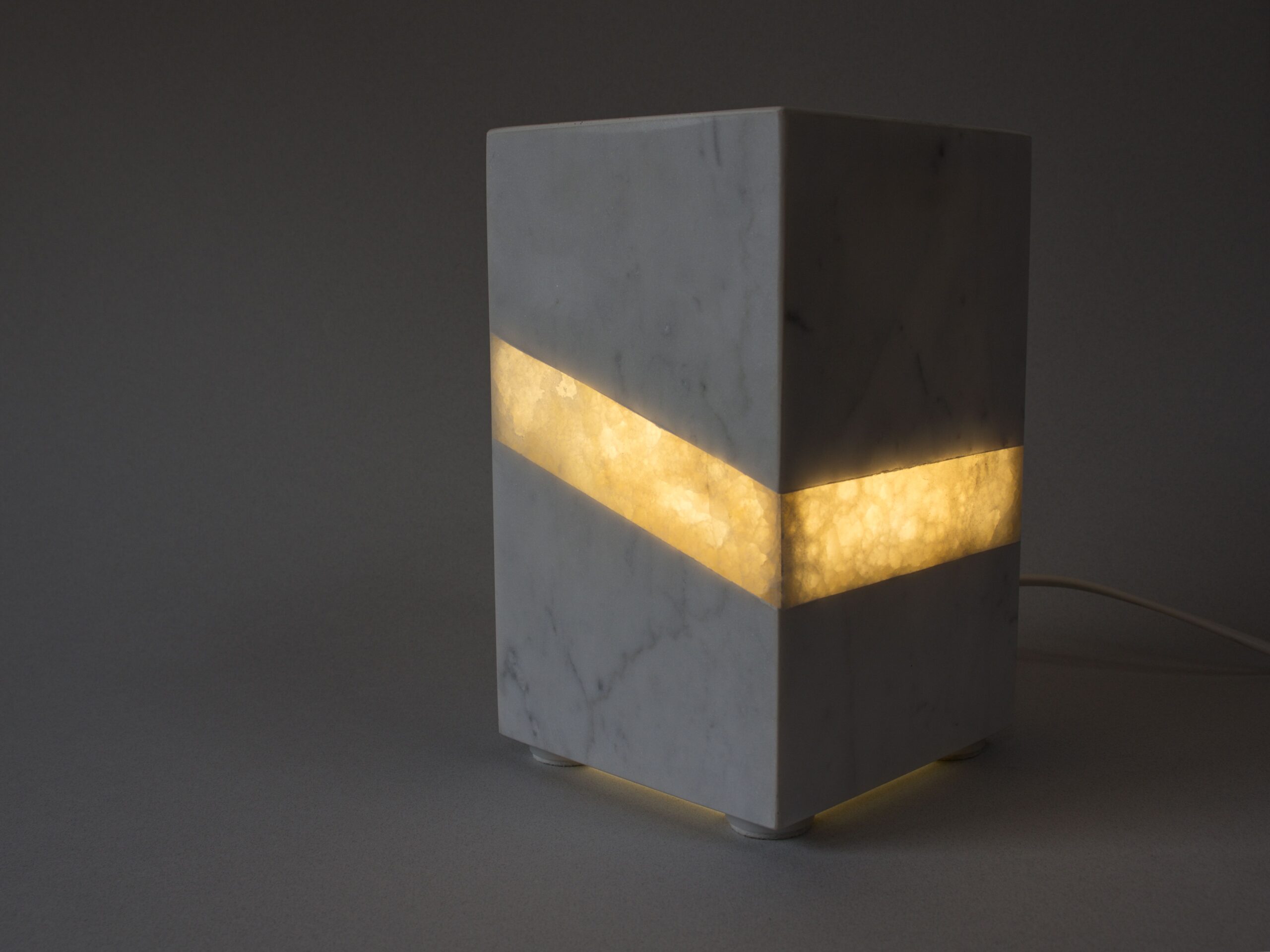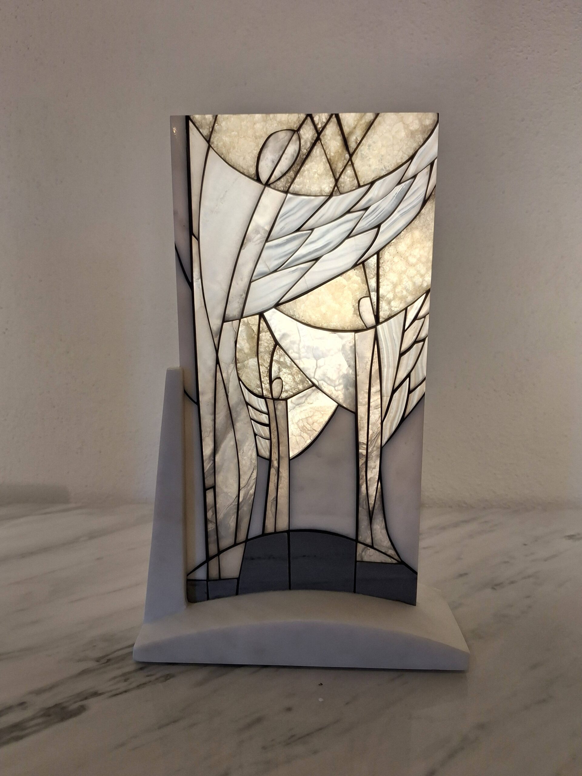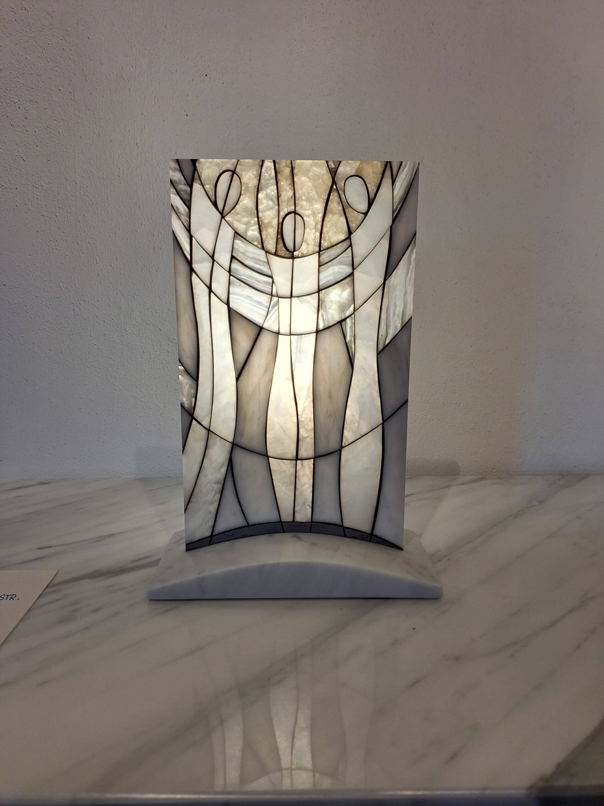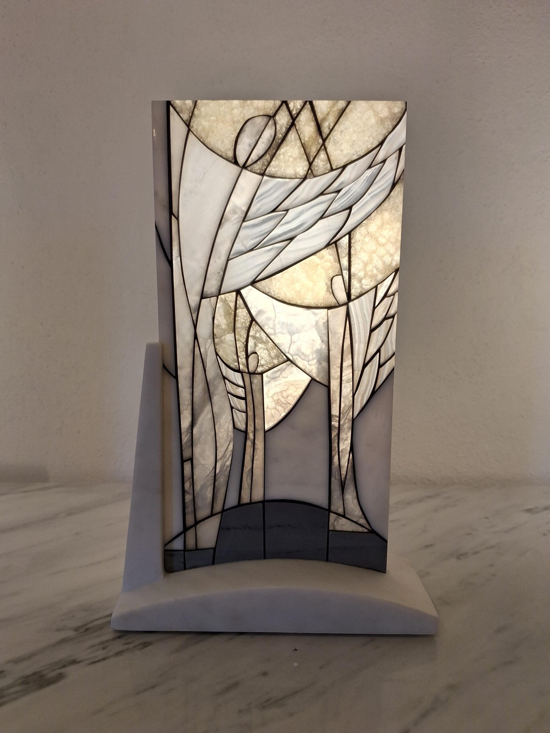 Z realizace jedné zakázky zbyly tenké plátké kamene Onyxu. S akademickým sochařem Petrem Váňou nás napadlo je složit v mozaiku. Tím začala moje dlouhá cesta vývoje technologie, postupů a výroby strojů na míru. Výsledkem jsou desítky malých kamínků, vybroušených do tlouštky několika milimetrů a přesně spojených dohromady podle kreseb Petra Váňi. Název „Kamenné světlo“ vychází právě z tenkosti kamene, které jsem schopný docílit a díky které i kámen propouští světlo.