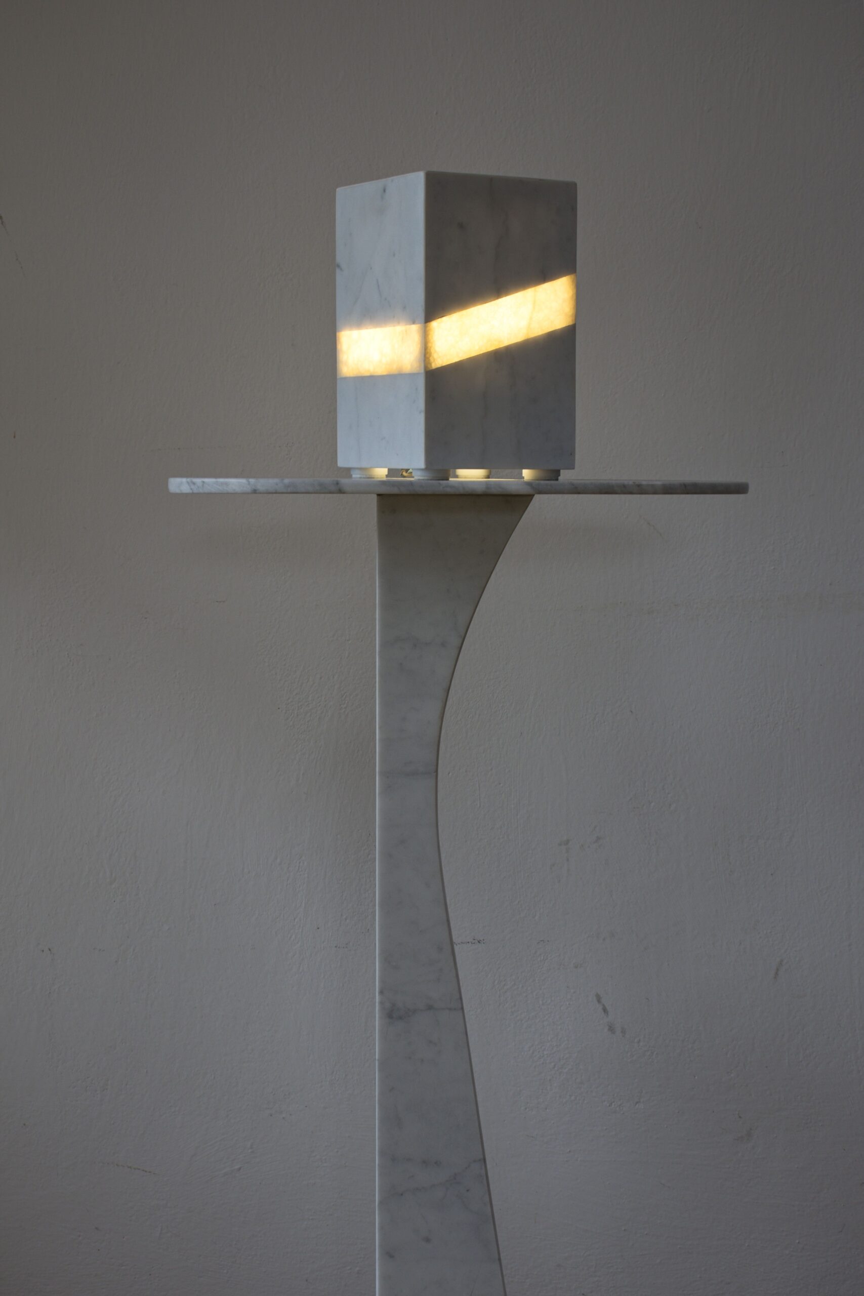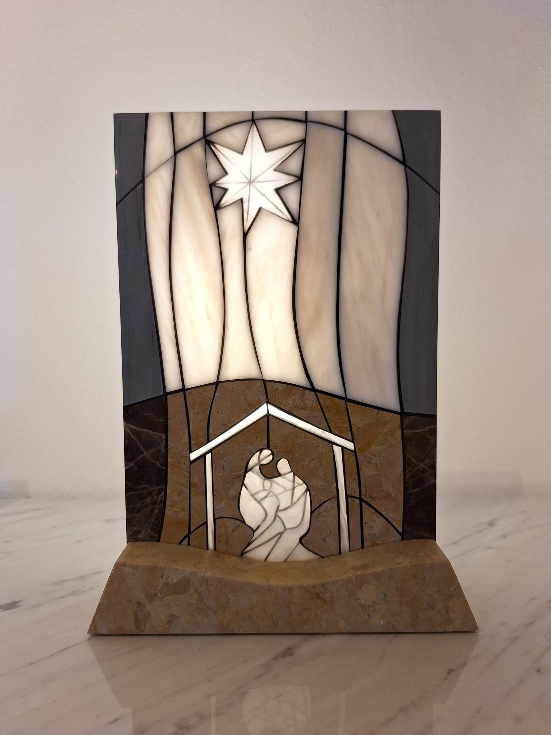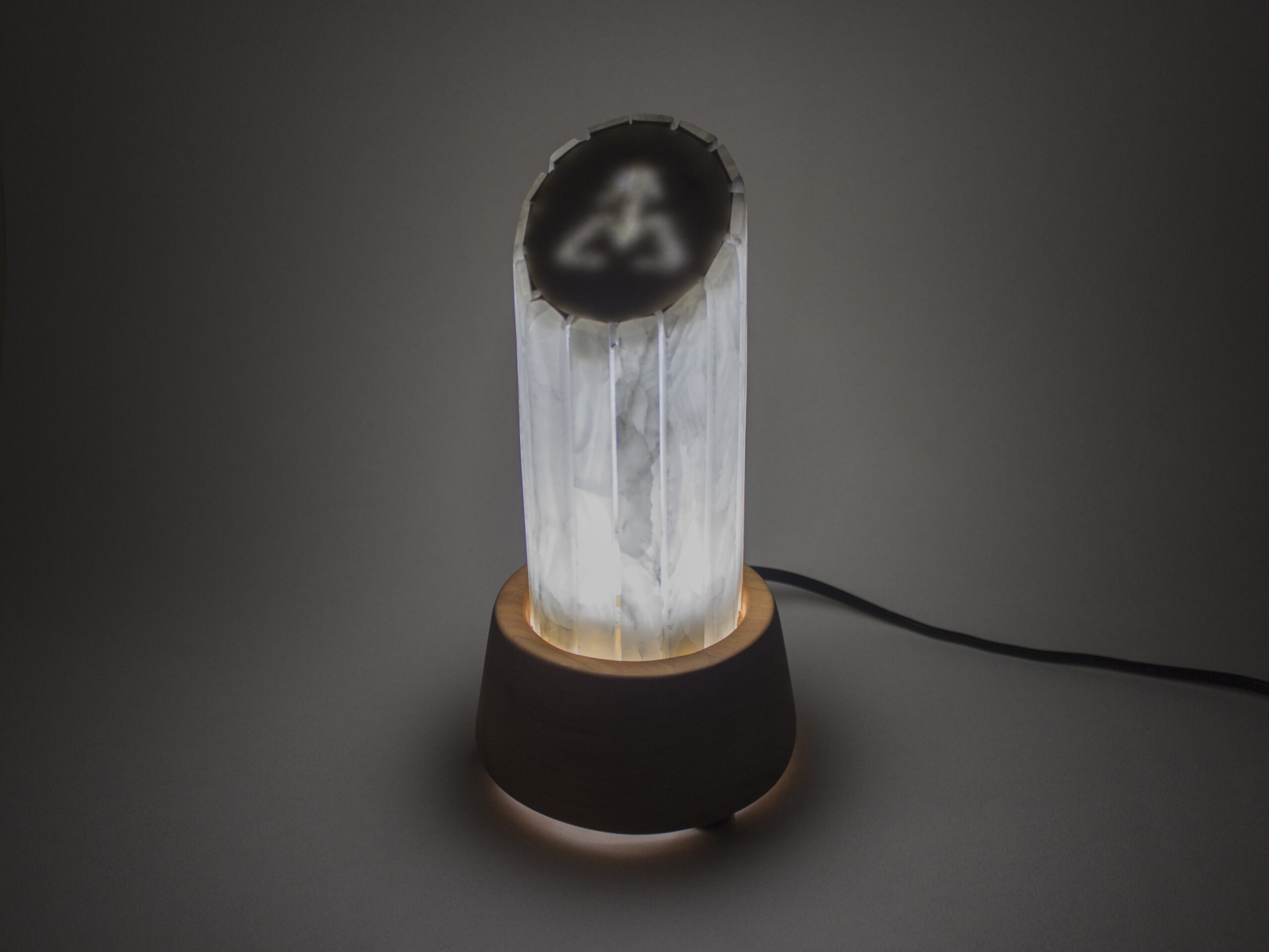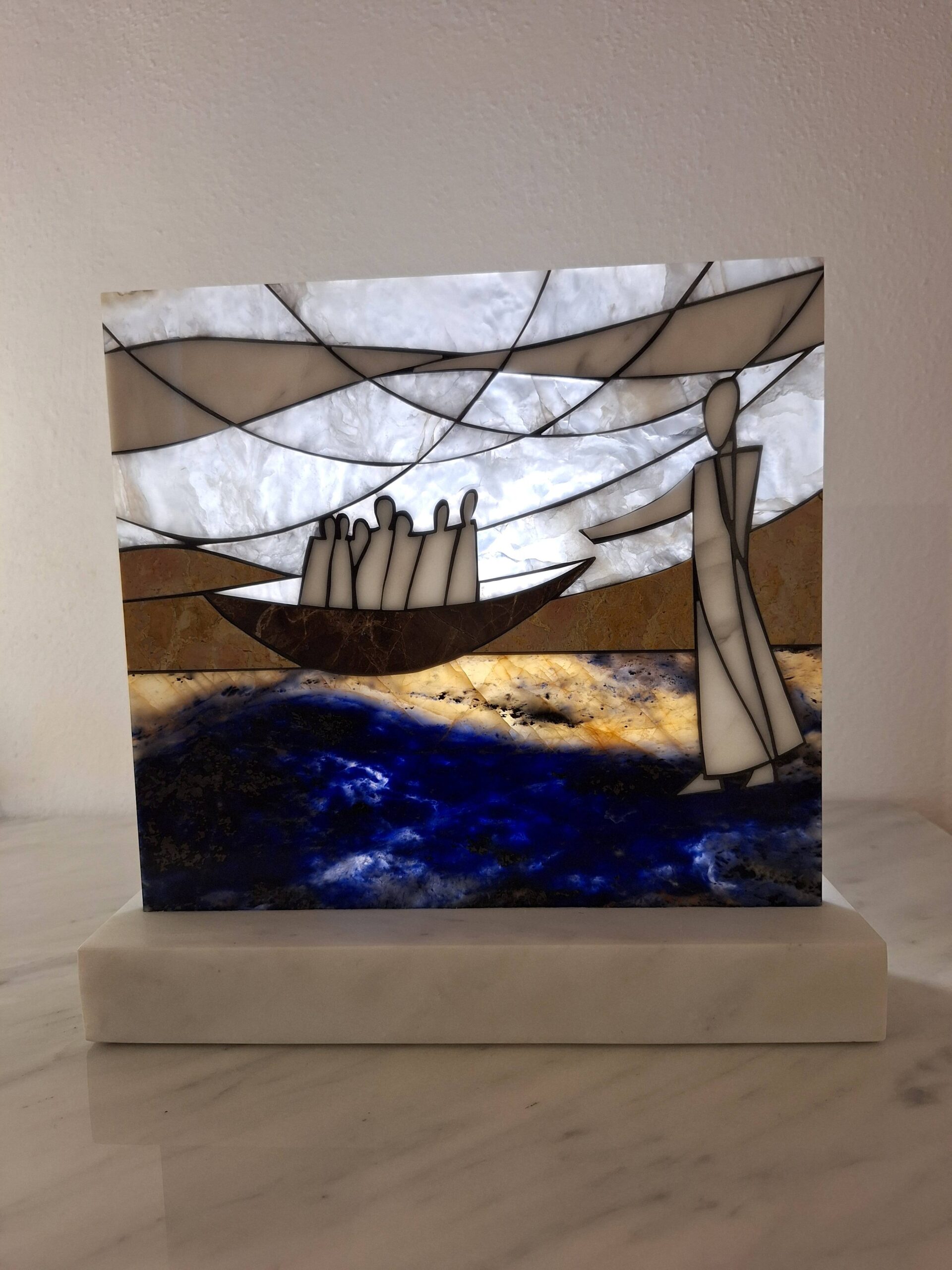 Z realizace jedné zakázky zbyly tenké plátké kamene Onyxu. S akademickým sochařem Petrem Váňou nás napadlo je složit v mozaiku. Tím začala moje dlouhá cesta vývoje technologie, postupů a výroby strojů na míru. Výsledkem jsou desítky malých kamínků, vybroušených do tlouštky několika milimetrů a přesně spojených dohromady podle kreseb Petra Váňi. Název „Kamenné světlo“ vychází právě z tenkosti kamene, které jsem schopný docílit a díky které i kámen propouští světlo.